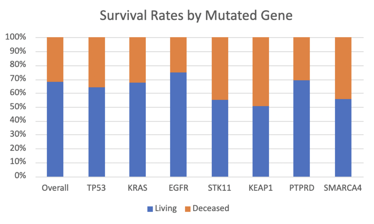 The findings from the MSK-IMPACT 2017 dataset demonstrate how mutation count and altered gene data can be used as a predictive marker in lung cancer. Understanding the genetics of lung cancer can lead to the development of personalized therapies targeting specific mutations, potentially improving treatment outcomes. Further research should focus on the specific unique consequences of mutations and how they function in relation to the cancer to gain a deeper understanding of lung cancer biology.